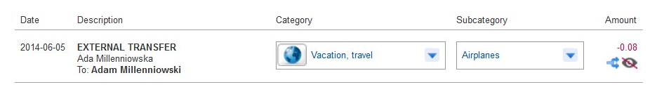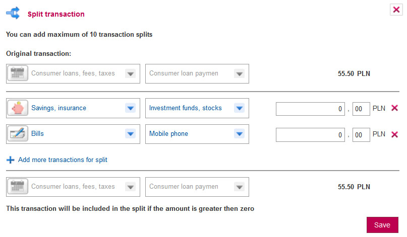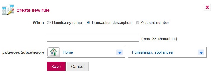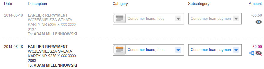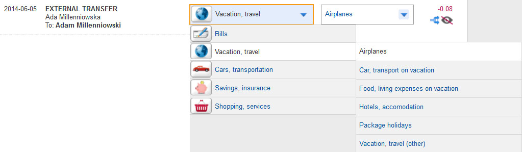 Transactions done on your accounts and cards are automatically assigned to categories. You can change categories and add your own subcategories.