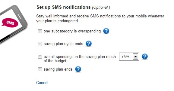 When you have reached a certain amount of spending in a category or subcategory, the system will text you with an appropriate warning.