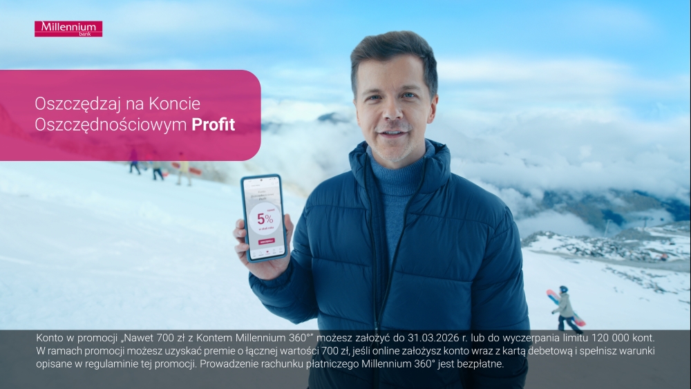 The new commercial of Bank Millennium allows viewers to move into the winter climate of high snow-capped mountain peaks, a gondola lift and snowboard madness in the snow. On the screen, we observe a group of friends who show off their sports skills. Maciej Musiał and Radosław Kotarski encourage you to open a Millennium 360° account with a selfie and become a professional in savings - See, just like a PRO. For me, fully professional. It's fun to be a PRO not only on the slopes. In savings too. It's simple. Get up to 5% per annum. Open a Profit Savings Account and meet the terms and conditions of the promotion. Want more benefits? Download the app, open a Millennium 360 account with a selfie, meet the conditions of the promotion and receive a PLN 700 bonus. - urge Radosław Kotarski and Maciej Musiał.