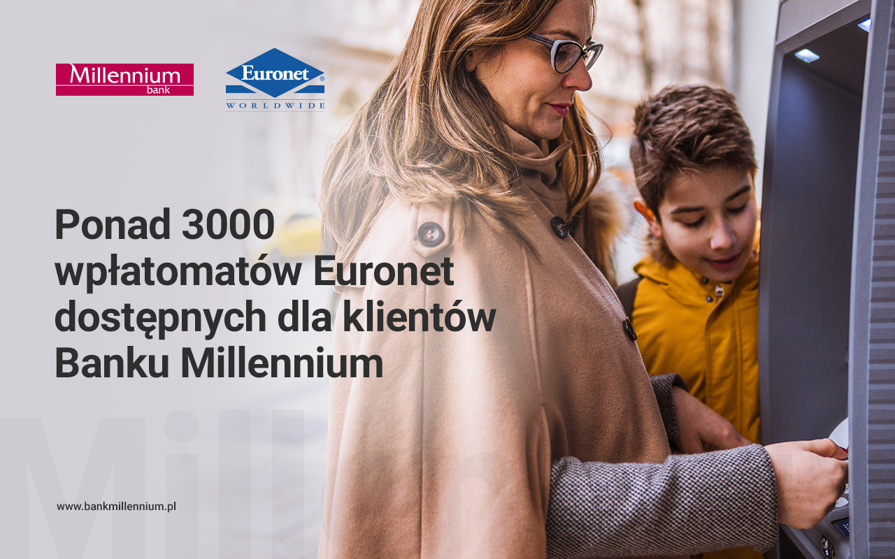 Bank Millennium udostępnił usługę wpłat gotówkowych w urządzeniach Euronetu. Tym samym klienci zyskali większą swobodę wykonywania takich transakcji. Poza urządzeniami Banku Millennium mogą teraz skorzystać z ponad 3 tys. wpłatomatów dostępnych w sieci Euronet.