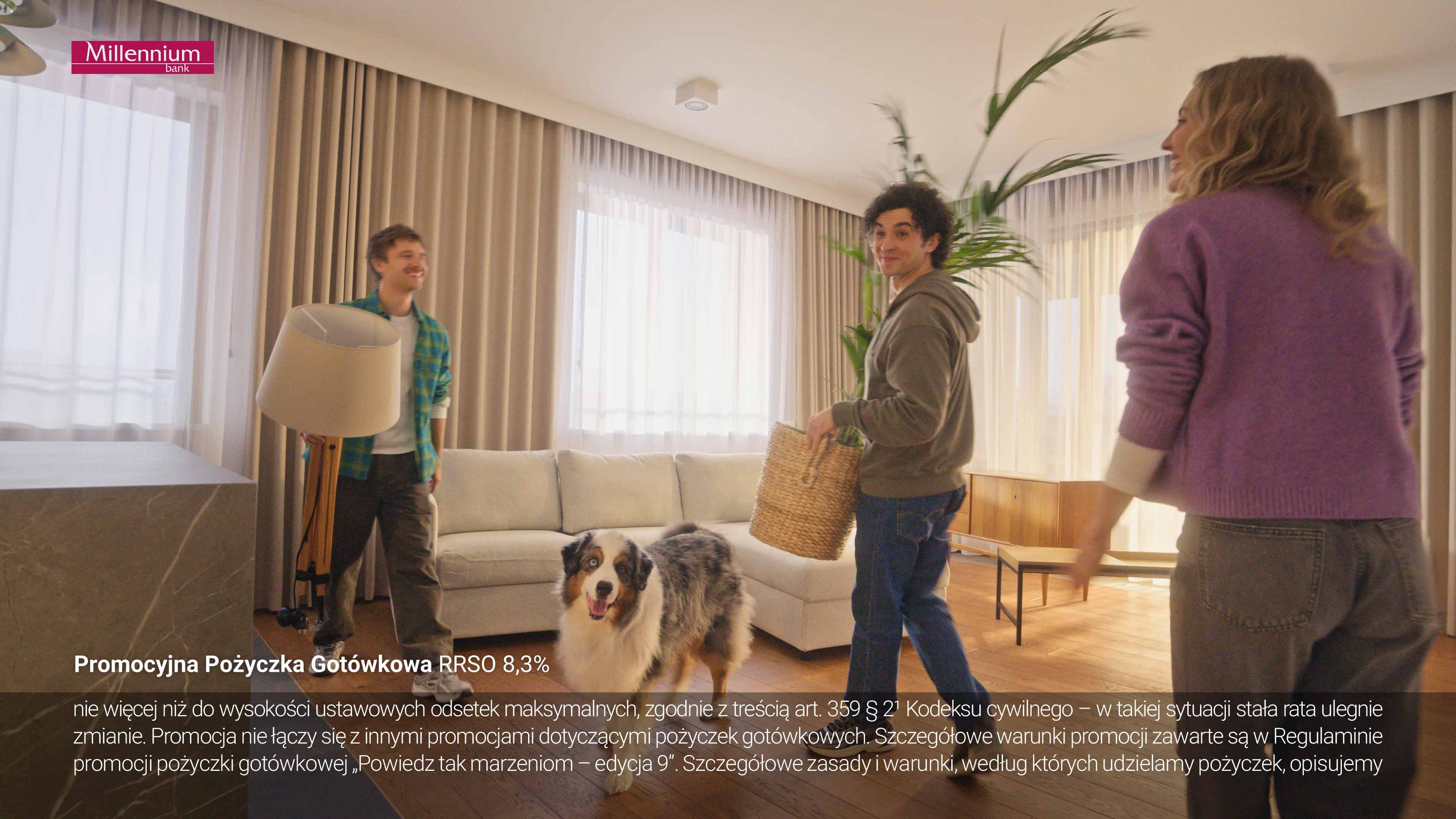 W nowej reklamie telewizyjnej Bank Millennium promuje wygodną pożyczkę ze stałą ratą i 0 zł prowizji (RRSO 8,3%)i. Na ekranie widzimy młodych, którzy spotykają się na spacerze z psem. Przypadkowa zawarta znajomość przeradza się w nieco poważniejszy związek. Planując wspólną przyszłość, para stara się na nowo urządzić mieszkanie z pomocą dodatkowych środków, które uzyskała w banku.